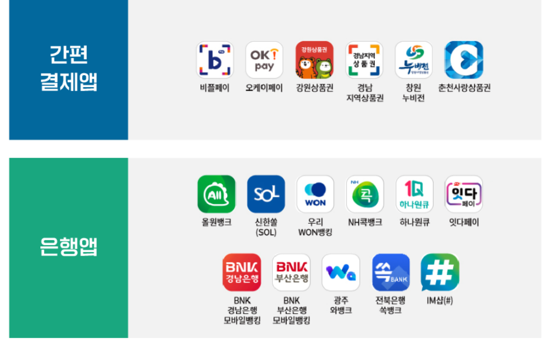 - 전용 앱 설치: 비플페이, 체크페이 또는 주요 은행 앱(농협 올원뱅크 등 17개 앱) 설치